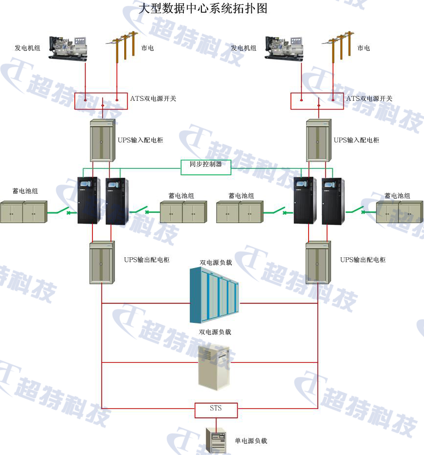 ??????1、電源系統(tǒng),通常選用多路市電源互為備份,并且機(jī)房設(shè)有專(zhuān)用柴油發(fā)電機(jī)系統(tǒng)作為備用電源系統(tǒng),市電電源間、市電電源和柴油發(fā)電機(jī)間通過(guò)ATS(自動(dòng)切換開(kāi)關(guān))進(jìn)行切換,為數(shù)據(jù)中心內(nèi)UPS(不間斷供電電源)、機(jī)房空調(diào)、照明等設(shè)備供電。由于大型數(shù)據(jù)中心業(yè)務(wù)重要性,通常采用雙母線(xiàn)的供電方案供電,滿(mǎn)足大型數(shù)據(jù)中心服務(wù)器等IT設(shè)備高可靠性用電要求。雙母線(xiàn)供電系統(tǒng),有兩套獨(dú)立UPS供電系統(tǒng)(包含UPS配電系統(tǒng)),在任一套供電母線(xiàn)(供電系統(tǒng))需要維護(hù)或故障等無(wú)法正常供電的情況下,另一套供電母線(xiàn)仍能承擔(dān)所有負(fù)載,保證機(jī)房業(yè)務(wù)供電,確保數(shù)據(jù)中心業(yè)務(wù)不受影響。在UPS輸出到服務(wù)器等IT設(shè)備輸入間,選用SPM(服務(wù)器電源管理器)進(jìn)行電源分配和供電管理,實(shí)現(xiàn)對(duì)每臺(tái)機(jī)柜用電監(jiān)控管理,提高供電系統(tǒng)的可靠性和易管理性。對(duì)于雙路電源的服務(wù)器等IT設(shè)備,直接從雙母線(xiàn)供電系統(tǒng)的兩套母線(xiàn)引人電源,即可保證其用電高可靠性。對(duì)于單路電源的服務(wù)器等IT設(shè)備,通常選用STS(靜態(tài)切換開(kāi)關(guān))為其選擇切換一套供電母線(xiàn)供電。在供電母線(xiàn)無(wú)法正常供電時(shí),STS將自動(dòng)快速切換到另一套供電正常的母線(xiàn)供電,確保服務(wù)器等IT設(shè)備的可靠用電。
