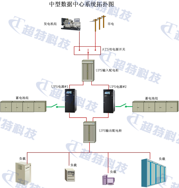 ? ? ?由于中型數(shù)據(jù)中心業(yè)務(wù)重要性,通常采用并機(jī)的供電方案供電,滿足中型數(shù)據(jù)中心服務(wù)器等IT設(shè)備高可靠性用電要求。并機(jī)供電系統(tǒng),由兩套獨(dú)立UPS并聯(lián)供電(包含UPS配電系統(tǒng)),在UPS電源需要維護(hù)或故障等無(wú)法正常供電的情況下,另一臺(tái)UPS電源仍能承擔(dān)所有負(fù)載,保證機(jī)房業(yè)務(wù)供電,確保數(shù)據(jù)中心業(yè)務(wù)不受影響。中型數(shù)據(jù)中心的基礎(chǔ)設(shè)施系統(tǒng)主要分電源、環(huán)境控制和機(jī)房監(jiān)控管理系統(tǒng)。由于中型數(shù)據(jù)中心承載企業(yè)、機(jī)構(gòu)的核心業(yè)務(wù),重要性較高。因而中型數(shù)據(jù)中心一般根據(jù)TIA942標(biāo)準(zhǔn)的Tier4和Tier3標(biāo)準(zhǔn)建設(shè),可靠性要求99.999%以上,以保證大部分異常故障和正常維護(hù)情況下,數(shù)據(jù)中心正常工作,核心業(yè)務(wù)不受影響。